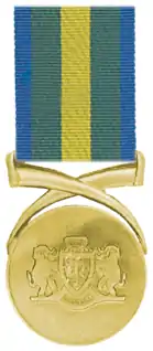 The Long Service Medal, Gold is silver-gilt medallion, 38 millimetres in diameter, depicting the Coat of Arms of the Republic of Venda.[7][8]