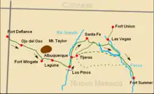 The campaign to subdue the Navajo by the Army was supplemented by raids by New Mexican and Ute slavers who fell on isolated bands of Navajo, killing the men, taking the women and children captive, and capturing horses and livestock. During the army campaign the Ute scouts attached to the army unit engaged in this activity and left destruction of Navajo infrastructure to the main army unit.[16] Following the surrender of the Navajo, the Utes continued to raid the Navajo as did New Mexican slavers.[17] A large number of slaves were taken and sold throughout the region.[18]
