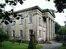 Longholme Methodist Church is Methodist church in Rawtenstall, Lancashire. 53°42′04″N 2°17′10″W / 53.70103°N 2.28619°W / 53.70103; -2.28619 (Longholme Methodist Church) The current building is the third used for methodist worship in Rawtenstall. It cost £7,000 and was opened on 18 March 1842. It provided 1300 seats for worshippers.[1] The building was designed by John Simpson of Leeds.[2] It was financed by the brothers Thomas, David and Peter Whitehead,[2] local businessmen who are buried in a shared grave in the churchyard.[3]