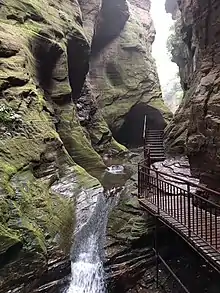 The U-shaped valley with a total length of 12 kilometers, covering an area of 20 square kilometers, is famous for its high mountains, quiet valleys, waterfalls, and special purplish-red quartz sandstone formed years corrosion of flowing water. It is also the core scenic spot of Wangwushan-Daimeishan UNESCO Global Geopark.[1]