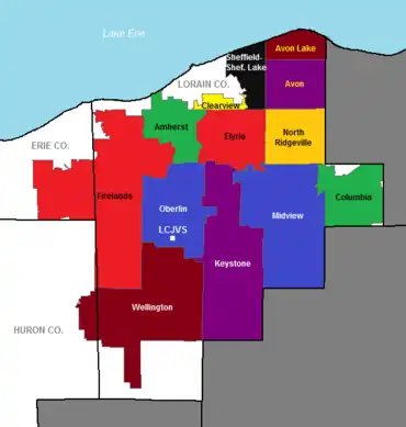 School districts served by Lorain County JVS. The school's location is marked with a white square in Oberlin's school district.
