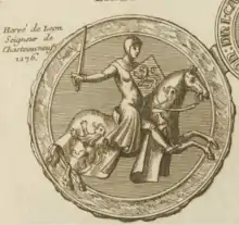 - Harvey IV: his son, married c. 1260 Matilda of Poissy, Lady of Noyon-sur-Andelle, Radepont, Hacqueville, Acquigny, died c. 1290 and was buried in the Abbey of Fontaine-Guérard.[2] In September 1281 he exchanged all his estated in Châteauneuf and Senonches with King Philip III the Bold. This part of the inheritance went to Louis of Valois, Count of Chartres, who had obtained the estate of Châteauneuf-en-Thymerais. When King Philip VI died childless in 1329, he gave his brother Charles II of Valois, Count of Alençon and Perche, a part of their brother's inheritance, and gave him in a charter dated May 1335 the lands of Châteauneuf-en-Thimerais, Senonches and Champrond among others.