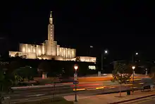 Construction was again delayed during the Korean War due to steel shortages. Preston Richards and Edward O. Anderson were sent to negotiate with the National Production Authority. The temple was soon designated an ongoing construction project and made exempt from steel rationing requirements.[2] Richards was present at the groundbreaking and helped lead fundraising efforts.[2] Richards died before seeing the temple's completion.[2] The groundbreaking took place in 1951.[3] The temple plans were revised at this time to include a priesthood assembly room, an unusual feature in temples built after the Salt Lake Temple. It was also expanded to accommodate an unprecedented 300 patrons per session.