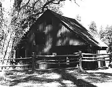 The barn is several hundred feet south of the office/living quarters. The barn is 24' 3" wide by 26' 7" long, with a steep-pitched gable roof covered in wood shingles. The internal components have not lasted through the years; while there is a loft door on the south end, there is no remaining evidence of the loft itself. The spring lies uphill from the two structures, and has been lined with concrete and capped.[10]
