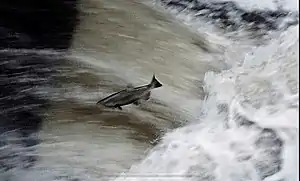 Fish were plentiful for the first settlers of Los Gatos Creek. Newspaper stories in the 1880s describe catches of 100 to 200 trout a day. One pioneer wrote that "speckled trout were so plentiful, they could be caught with your hands."[9] Based on the locations of fish collections made in 1895 and historical habitat condition suitable for salmonids, Los Gatos Creek likely supported a healthy population of steelhead trout (coastal rainbow trout) (Oncorhynchus mykiss irideus).[10] A 1952 California Department of Fish and Game document stated that substantial steelhead runs had not been seen in Los Gatos Creek since 1937, when agricultural pumps lowered the water table throughout the Santa Clara Valley and dewatered the lower reach. However, stream resident coastal rainbow trout populations remain in the portions of the creek maintaining permanent flow, just below and above of Lexington Reservoir. The Santa Clara Valley Water District reservoir system has now raised water tables sufficiently that lower Los Gatos Creek once again supports steelhead trout. However, stream resident rainbow trout may produce offspring which become anadromous.[11]