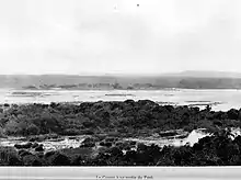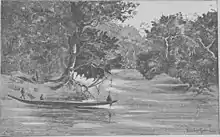 On 8 December they camped at a place named Khonzo. Stanley steamed the Royal upstream and was able to get within 1.5 miles (2.4 km) of Isangila. From Khonzo 100 men went overland making the road, while the steamers carried materials up by water.[4] By 30 December the expedition had made camp .75 miles (1.21 km) from Isangila, and the steamers were in a cove from which a road could be made to haul them up to their launching place above the rapids. Stanley left Valcke in charge while he returned to Vivi to haul the new wagons and new steel lighter that had been left at the Bundi. The boats were on shore in the camp on 2 January 1881 to be repaired, scraped and painted in readiness for the journey to Manyanga.[5]