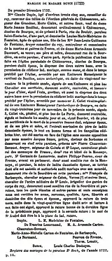 - ↑ Source: marriage register of the parish of Saint-Roch in 1722, page 14. This register was destroyed in the fire of the City Hall of Paris on 24 May 1871.