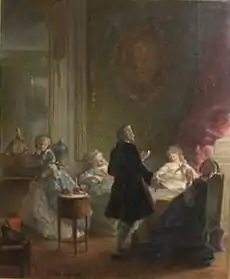 - Hôtel de Vins, in the Plâtrière street (now Jean-Jacques-Rousseau street), dependent of the parish of Saint-Eustache, Paris. The Dupins loved this Hôtel and they settled there after two years of works. It was in this house that Jean-Jacques Rousseau was introduced to Madame Dupin, in March 1743. On 22 February 1758, Claude Dupin and his wife finally buy this place to Marc Antoine Bouret, receiver general of finances, for the amount of 190,000 livres.[45] Claude Dupin dies in this Hôtel on 25 February 1769.[46] The Hôtel de Vins was a promised inheritance to his eldest son, Louis-Claude Dupin de Francueil after the death of his stepmother Madame Dupin; however, he died before her on 6 June 1786, so the property finally passed to his daughter, Suzanne-Madeleine Dupin de Francueil, from the estate of Madame Dupin in 1799.