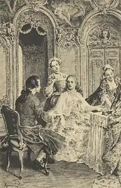 - The mansion occupied by Madame Dupin was located just down the Plâtrière street [...] Rousseau walked to her little salon and went into the waiting room after having announced by the valet. When taking place on the bench, he smoothed his brocade vest and adjusted his sword. Although he was at his service for nearly four years, Jean-Jacques had never felt at ease in the presence of Madame Dupin. Barely older than him, she had nevertheless managed to preserve her beauty. The grace and elegance of her manners were still enhanced by the delicacy of her features. We can found into her circle the most prestigious guests from Voltaire to Buffon, but also the most prominent members of the Parisian aristocracy. Lively and witty, she was praised even in the homes of other salon-holders. Yet it was in the privacy of one-on-one that the young woman disturbed Jean-Jacques. Her face had a very white complexion, her blond hair pulled back and the softness of her voice made her almost unreal. In those moments, we thought he was dying to talk to her in a whisper, for fear of breaking the spell.