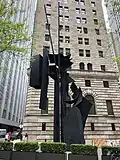 On 14 April 1977, the site, then known as Legion Memorial Square, was initially dedicated by Mayor Abraham Beame who "hailed Nevelson's sculpture as an antidote to a spate of recent violence in the city".[11]:54[14] In 1978, the space designed by Nevelson was renamed Louise Nevelson Plaza in a dedication ceremony presided over by Mayor Ed Koch and business magnate David Rockefeller,[11]:54 becoming the city's first public space to be named after and designed by a living artist.[2]:90 According to scholar Richard Lacayo, the largest one of the seven sculptures installed in the plaza, standing 70 feet tall, "unfurls majestically against the heavy stone of the Florentine-style Federal Reserve Bank across the street".[15] Writing for Time in 1981, art critic Robert Hughes described the works in the plaza as "big, imposing and mannered".[16]:8 In December 1978, Nevelson dedicated another public sculpture in the Lower Manhattan titled Sky Gate, New York, which was installed in the mezzanine lobby of 1 World Trade Center on the opposite site of the Financial District.[17]