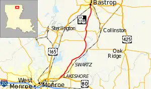 - ↑ Louisiana Department of Highways, Traffic and Planning Section (1948). Ouachita Parish (Map) (January 1, 1955 ed.). Scale not given. Baton Rouge: Louisiana Department of Highways.