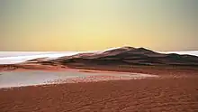 Louth contains the lowest-latitude permanent deposit of water ice on the Martian surface, in a mound situated at the crater's center.[7][8] The mound is quasi-circular and has an approximate diameter of 10 kilometres (6.2 miles).[9] The steady-state value for the albedo of the central ice mound is 0.431.[8] The mound consists of smaller ice grains interspersed with more palagonite contaminant at its edge, compared to the center.[4][3] Large grains of ice suggest that the central portion is the oldest in age, and brought to the surface either through the sublimation of ice or aeolian processes.[4] The water ice at the center of the crater as analyzed through spectral modelling determined that the water ice at the center of the mound was 99-percent pure at the optical surface.[4] The ice mound was determined to be similar in texture and composition to the northern polar ice cap.[10][11] Studies of the crater's interior, knowing their similar makeup, can yield insight on the interaction between the north polar region and the atmosphere.[12] Additionally, craters with ice mounds such as Louth can serve as records of the Amazonian era of Martian geology.[13] Craters like Louth have been used as potential analogues for understanding similar processes occurring on Pluto.[14][15]
