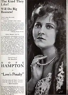 Love's Penalty is a 1921 American drama film written and directed by John Gilbert. The film stars Hope Hampton, Irma Harrison, Mrs. Phillip Landau, Percy Marmont, John B. O'Brien, and Virginia Valli. The film was released in June 1921, by Associated First National Pictures.[1][2][3]
