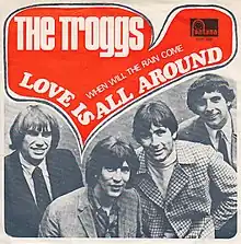 Reg Presley, lead singer of the Troggs, wrote "Love Is All Around" in about ten minutes, inspired by a TV broadcast of the Salvation Army band Joystrings performing an evangelical song titled "Love That's All Around".[5][6] The Troggs recorded Presley's song at Pye Studios for the record label Page One owned by their manager Larry Page, who also produced the recording.[7], The single was released in the UK in October 1967. The Troggs had intended to sever ties with Page and his record label earlier that year; however, after the success of the single they decided to stay, though changed managers.[8][9][10] The single was released in the rest of Europe and North America on Fontana Records. The B-side, "When Will the Rain Come" was written by drummer Ronnie Bond.[11]