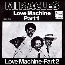 "Love Machine" was a multi-million selling Platinum single,[2] and a number-one smash hit on the U.S. Billboard Hot 100, the best-selling single of the Miracles' career, having sold over 4.5 million copies.[3][4][5] The single went to number 5 on the Hot Soul Singles chart,[6] and went to number 20 on Record World's National Disco file Top 20 chart. It was also a Top 10 hit in the UK, peaking at number three on the UK Singles Chart.