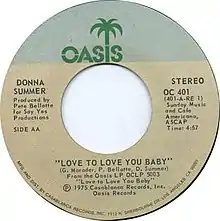 "Love to Love You Baby" is a song by American singer Donna Summer from her second studio album, Love to Love You Baby (1975). Produced by Pete Bellotte, and written by Italian musician Giorgio Moroder, Summer, and Bellotte, the song was first released as a single in the Netherlands in June 1975 as "Love to Love You" and then released worldwide in November 1975 as "Love to Love You Baby". It became one of the first disco hits to be released in an extended form.