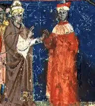 Géza II and Pope Alexander III's envoy, papal legate Pietro di Miso signed a concordat in the summer of 1161 that Lucas mediated. It guaranteed that Géza II would not depose or transfer prelates without the consent of the Holy See, the Holy See could not send papal legates to Hungary without the king's permission, and Hungarian prelates were only allowed to appeal to the Holy See with the king's consent.[29][35][37] Pope Alexander, who was fully aware of Lucas' allegiance and foreign policy activities, showed his appreciation by sending Lucas the archiepiscopal pallium in July 1161, confirming that Lucas' election occurred three years earlier.[38] According to a decretal of Pope Alexander III issued in 1167 or 1168, when the papal legate, cardinal Pietro di Miso was sent to Hungary to hand over the pallium to Lucas, the archbishop's brother "Alban" (most scholars identified him with Apa) provided a horse for the legate when Pietro and his escort entered the Hungarian border via Dalmatia across the Adriatic Sea. The letter stated that Archbishop Lucas worried this step could be seen as simony in the Roman Curia. Pope Alexander reassured the prelate with Biblical phrases and warned Lucas not to disturb him with trivial matters.[39] The decretal, which later became part of Decretales Gregorii IX (or Liber extra), reflects Lucas' rigid individuality, excessive strictness, and extreme Gregorian views which characterized his reign as Archbishop of Esztergom.[5][22][40]