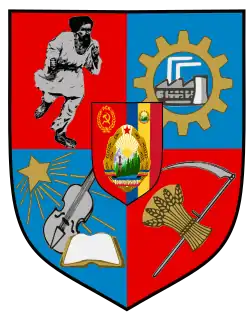 The Morning Star reference peaked in usage under the communist regime. With the advent of Socialist Realism, Eminescu's political works were ignored, but Luceafărul remained in the textbooks, with commentary by Perpessicius and Alexandru Rosetti.[82] Mythical recovery was particularly strong during the final stages of national communism, when, Negrici argues, Eminescu was publicly celebrated with "grotesque displays".[90] Both "Morning Star" and "Demiurge" were informal titles used in the personality cult of President Nicolae Ceaușescu.[91] The new arms of Botoșani County, approved in 1972, featured an allegorical and canting representation of Eminescu as a five-pointed star.[92] In 1988, the Romanian Communist Party fabricated an Eminescu Pond in Ipotești, complete with neon lighting in the shape of a Morning Star.[93] During that period, Sabin Bălașa contributed a fresco of Hyperion for the halls of Alexandru Ioan Cuza University.[94] Young Romanian poets also took interest in the myth, with Ana Blandiana penning Octombrie, noiembrie, decembrie ("October, November, December"), which is in part a feminized version of Luceafărul.[95]