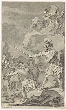 Engraving by Ludwig Gottlieb Portman depicting a Lucius Siccius Dentatus' last stand against soldiers ordered to murder him.