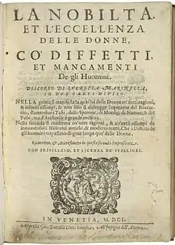 Marinella took the first part of her own title from the Italian translation of a supposedly anonymous French tract, "Della nobilita et eccellenza delle donne,"[17] printed in Venice in 1549.[18] The book was largely a long polemic of attacks against women and their defense. It also mounted an attack on men for exactly the same vices Passi had accused women of.[3] The structure of her text follows that of Passi's, as she pits quotations and examples against each other.[14] Many note that this was her most provocative writing and was likely set-off by Passi's demeaning of female learning and opinions.[14] Marinella was the first woman in Italy to argue with a man in print, and it was the only time she wrote explicitly about the misogyny of Passi.[19] Her vibrant responses to misogyny are the reason she is still recognized as one of the great examples of female erudition. It is thought that La nobilita, et l’eccellenza delle donne was published so quickly due to the connections Marinella had with the Venetian Academy.[2]