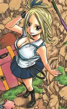 Critical reception of Lucy's character has been mixed. Critics have commented on her characterization in the manga series. While reviewing the manga, Carl Kimlinger of Anime News Network (ANN) regarded Lucy's relationship with her celestial spirits as "awful".[81] He considered Lucy "sympathetic", despite stating that her character development was lacking.[82] Rebecca Silverman of the same website characterized Lucy as "kind of annoying".[83] Nevertheless, the writer described Lucy's confrontation with one of Dragon Slayer Laxus Dreyar's allies as "breathtaking"; Silverman elaborated on this aspect by saying this battle had "a combination of emotion, intellect, and good old fashioned brawling to maximize the reader's involvement in the story", adding that no other major fight in the series contained the same mixture of elements.[84] Silverman further wrote that Dragon Slayer Wendy Marvell took over Lucy's role as the main female character of the story for a limited amount of time.[85] The writer enjoyed the "reaffirmation of Lucy's bond with her spirits" and stated that Lucy's role in her team-up with Natsu against a member of the dark guild Grimoire Heart was a bizarre yet major one.[86] A. E. Sparrow of IGN compared the way Lucy was drawn with how the characters Nami and Vivi were portrayed by manga artist Eiichiro Oda in the One Piece series. The reviewer regarded Lucy's ability to summon celestial spirits as "great" and thought it would be fun to see what other keys she could collect in the future.[87] Dale North of Japanator felt that Lucy had the widest variety of facial expressions among the Fairy Tail characters and described her as "cute".[88] Richard Gutierrez of The Fandom Post said that Lucy had become a stronger person following Fairy Tail's fight against the Phantom Lord guild.[89]