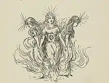 She would later write an introductory book for children about chemistry, Real Fairy Folks, or, The Fairy Land of Chemistry: Explorations in the World of Atoms (1887). This book stands in a Victorian tradition of using fairies to explain the sciences (especially botany, through the folkloric connections between fairies and flowers).[6] The frontispiece, for example, shows fairies clambering over a glass retort; another illustration shows the fairies H and Cl holding hands to form HCl, or hydrochloric acid. Meyer's book offered numerous practical examples of experiments that could be carried out with everyday materials like candles and vinegar.[6] The illustrations reinforce the concepts being presented: fairy gases fly about actively, while fairy solids huddle together on the ground. For Victorians like Meyer, there was no contradiction in using fancy to present fact, for the natural world was full of wonders just as marvelous as those of the imagination.[7]