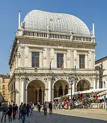 In 1567, Beretta designed the Seminary of Brescia, near San Gaetano. He directed the architectural works for the Palazzo della Loggia in Brescia, which had originally begun in the previous century. He had proposed solutions for the orders of arches, but these were abandoned. Works begun in 1553 were modified in 1554 following an intervention by Sansovino. The upper hall of the palace was covered in 1560, while the windows, incorporating suggestions from Palladio, were modified in 1562. The palace was nearly complete by Beretta's death, though a fire three years later destroyed its roof. Still, it appears today very nearly as the architect had completed it.[1] Some of Brescia's finest interior architectures are its vestibules, preserved to date.[3]