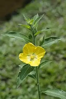 Ludwigia peruviana, with the common names Peruvian primrose-willow[2] or Peruvian water primrose, is an aquatic, sometimes deciduous species of flowering plant in the evening primrose family. It can grow to approximately 12 feet (3.7 m) in height. While native to Peru, it has been introduced in many other countries for its attractive simple yellow flowers, it is now a common weed in swampy areas around the world.[3]