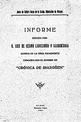 Lezama's scientific contribution to vascólogia is minor. His key work[80] is Informe acerca de la obra manuscrita conocida con el nombre de "Crónica de Ibargüen" (1921), a 47-page commentary[81] on a 16th-century chronicle, just purchased by the Biscay diputación;[82] it covered bibliographic, geographical, heraldic, archeological and linguistic issues.[83] Other attempts are largely bibliographical and partially biographical pieces published in Revista Internacional de los Estudios Vascos in the 1920s;[84] one of them, El Vascófilo Franciscano R. P. Fr. Juan Mateo de Zabala, was dedicated to an early vascólogist and brother of his maternal grandmother.[85] Despite rather modest output, at least compared to scientific writings of other SEV leaders like Julio Urquijo, Luis Eleizalde or Resurección Azkue, in friendly press Lezama was hailed as “vascofilo ilustrísimo”.[86]