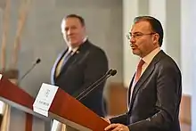 Luis Videgaray Caso (born 10 August 1968) is a Mexican politician who served as the Secretary of Foreign Affairs from 2017 to 2018. Previously he was the Secretary of Finance and Public Credit, also in the cabinet of Enrique Peña Nieto, from 2012 to 2016. Prior to Peña Nieto's victory in the elections, Videgaray was General Coordinator of his campaign for the 2012 Mexican presidential election.[1] On July 11, 2012, Peña Nieto announced Videgaray as the person in charge of promoting the economic reforms and the government agenda's related topics,[2] and on September 4, he named Videgaray as co-head of the team that set policy direction for the new government that took office on December 1, 2012.