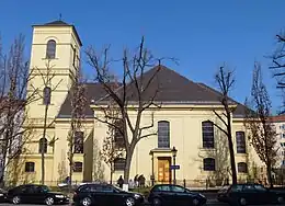 The original plan of the church in Baroque style was by Philipp Gerlach, but it was simplified by Martin Heinrich Böhme,[3] a pupil of Andreas Schlüter. The church was inaugurated on 12 July 1716[3] as the municipal and parish church by Michael Roloff of the Friedrichswerdersche Kirche in Berlin. The building has a floor of a Greek cross. It first had no steeple, but a little wooden ridge turret. In 1814, the turret was unstable and had to be removed.[1] Karl Friedrich Schinkel made a suggestion in 1821 how to rebuild the church, with a steeple on a side. His plans were approved in 1823, but again in a simplified form.[4] The steeple, which holds three bells, was inaugurated on 11 June 1826.[5]