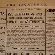 In their early days they built Itchen Ferrys, Fishing Smacks, Pilot boats and other sorts of working boats, like a 75-foot Lifeship to a design by Capt. Hans Busk in 1873. But there were also yachts built as early as the 1870s.[2] In 1895, the yard moved from the river Itchen to the village of Hamble at the river of the same name, near Southampton. The former Itchen Yard then became known as Fields Yard. According to an advertisement in an 1891 edition of The Yachtsman, they had "Yachts for sale or hire, Spars, blocks, Anchors, and Galvanised Ironwork either kept in stock or made on the premises, all sorts of chandlery, mudberths". Soon after, they were based at Back Street (now Rope Walk) with building sheds, slipways and yacht stores. Hamble Point became their winter slips.