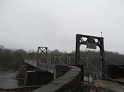 In 1835, a covered bridge was built across the Delaware River to Raven Rock, New Jersey. The river is approximately 800 feet wide at this point. One span of it was carried away in the flood of 1903. That section of the bridge was rebuilt as a steel span. The bridge was used until 1946. In 1949, a new bridge was built on the piers of the original, but it was built only for foot traffic so that the people of Lumberville could have access to the Pennsylvania Railroad commuter passenger service in Raven Rock. The rail service was discontinued in 1952.