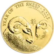 The reverse design consists of two Yorkshire Swaledale sheep facing each other and the background consists of a forest of trees.B As designer Wuon-Gean Ho explains "the ancient Chinese character for the word sheep looks a little bit like a tree" so the forest consists of a series of this character (羊).[3] This character is further displayed near the coin's center. Across the top lettering reads "YEAR OF THE SHEEP · 2015" plus details of the mass and metal content of the coin.