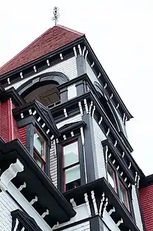 The three-storey wooden building is located on a 3.7 acre (1.5 ha) lot atop Gallows Hill at 101 Kaulback Street, adjacent to the Old Town Lunenburg Historic District.[2]: 17 [4] Due to its size and elevation, the structure is visible when approaching the town from most directions.[4] It sits on a granite block foundation topped with brick and is designed in the Second Empire style, with a mansard roof, large central chimney, Oriel and Venetian windows, and towers capped with pyramidal roofs.[2]: 18 The central tower houses a large school bell. The exterior was originally yellow and brown, but was painted white, red, and black after World War II.[2]: 13 It is ornamented with horizontal belt coursing, intricate bracketing, and pediments over windows and doors.[2]: 23 [4] Margaret Atwood described the building as "an extraordinary mansard-roofed construction... a sort of Charles Addams nightmare, only white".[7]