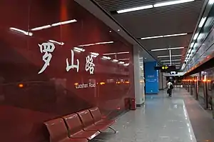 Luoshan Road (simplified Chinese: 罗山路; traditional Chinese: 羅山路; pinyin: Luóshān Lù) is a Shanghai Metro interchange station which serves both Line 11 and Line 16. Line 11 opened on 31 August 2013,[2] with the first section of Line 16 opening on 29 December 2013.[1] It was formerly Line 16's northern terminus before its extension towards Longyang Road. It was also Line 11's eastern terminus before the extension to Kangxin Highway opened on 19 December 2015.