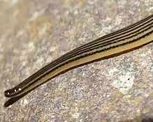 Luteostriata abundans is a small to medium-sized land planarian with an elongate body and parallel margins. The largest specimens have a length of about 60 millimeters or more. The dorsum has a yellow tinge, varying from cream to dark yellow or light brown and is marked by seven longitudinal dark brown to black stripes. The ventral side is cream.[1] The presence of seven stripes distinguishes it from other members of Luteostriata.[2]