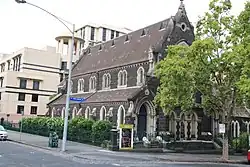 Half an acre of land (2,000 m2) in East Melbourne was granted on 19 January 1853 for construction of a church.[2] Donations, a government grant and a bank loan covered the cost; the foundation stone was laid on 27 September 1853 and the dedication of the completed church occurred on 11 June 1854.[3] Additional land was granted in February 1855 for the manse.[4]