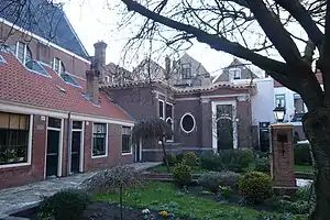 The Lutherse Hofje is situated on the north side of the church, with several rooms (left) attached to the church itself. In the back of the small houses is the Regent's room with outdoor pulpit.