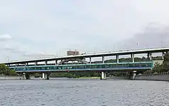 Luzhniki Metro Bridge (Russian: Лужнецкий метромост), also known as Metromost (Метромост), is a concrete double-decked (two-level) arch bridge carrying a road and a Moscow Metro line across the Moskva River in Moscow, Russia. It connects the neighbourhood of Luzhniki Stadium to Sparrow Hills. The bridge houses Vorobyovy Gory, the only station of Moscow Metro located over water. Designed in 1958 by V.G. Andreyev and N.N. Rudomasin (structural engineering), the bridge rapidly decayed and was rebuilt in 1997–2002.