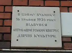 ![]() The memorial plaque on the wall of the Hnat Khotkevych Palace of Culture dedicated to the Lviv Anti-Fascist Congress of Cultural Workers which took place in this building in 1936 | |