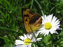 All Copper butterfly's population density suffers from Wasp predation (paper wasps mostly) as, for the wasp's larvae, they are a good source of protein. In its larvae stage, there have been reports of parasitism from certain types of Ichneumonids (Gibbs 1961).[4] The larvae kill the host by feeding either internally or externally while they are getting ready to pupate (Hawkinson 2005). Further studies of this species are needed to have concrete observations.
