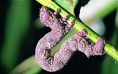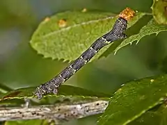The caterpillar of the brindled beauty ranges from greyish-green or brown in colour purplish, with thread-like longitudinal black lines and with yellow marks near the segment incisions.[4][6]