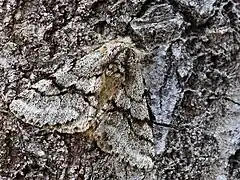 The brindled beauty has a wingspan of 4–5 cm. It is a large-bodied furry moth, which has a pattern which provides near-perfect camouflage on tree trunks and also gives the moth its name. The forewing ground colour is usually grey with black dusting. There is a curved anterior and a curved exterior cross line limiting the midfield. The Hindwings are also grey and have two or three crosslines. The females have a pale yellow suffusion on the wings and the front edges of their forewings are paler.[4] The males show large comb-like antennae.[5]