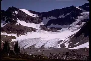 Lyman Glacier is in Wenatchee National Forest in the U.S. state of Washington and is just northeast of Chiwawa Mountain.[2] Between the years 1890 and 2008, Lyman Glacier has retreated 1,310 m (4,300 ft) and lost 86 percent of its area, a reduction in its surface from 1.41 to .02 km2 (0.5444 to 0.0077 sq mi).[3] Lyman Glacier terminates at a proglacial lake and a series of smaller lakes as well as a pronounced terminal moraine indicate where the glacier once extended to.