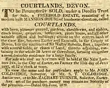 ""A freehold estate consisting of a mansion house of handsome elevation called Courtlands with lawn, pleasure ground, garden, shrubberies and stables, coach house, graperies, hothouses, greenhouse and all other suitable offices and buildings."[4]