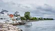 Taarbæk is a small town or neighbourhood located in the eastern part of the municipality. It borders the Øresund to the east and Jægersborg Dyrehave to the west. Klampenborg is located to the south. Although Taarbæk is technically connected to the Greater Copenhagen Area, and thus a neighbourhood of Copenhagen, it is in the outskirts of the Greater Copenhagen Area and is occasionally referred to as its own town. Taarbæk is a former fishing village, with many old fishing houses preserved. The neighbourhood is, however, dominated by high-end luxury villas. Taarbæk Church and Taarbæk Harbour are both located centrally in the neighbourhood.[6]