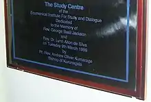 Lynn de Silva's father and three of his brothers were Methodist ministers. According to Walter Small, Lynn de Silva and his brothers Fred and Denzil were among the most significant Methodist writers during the period 1931–1964 in Sri Lanka.[6][7] After entering active service in the Methodist ministry in 1946, de Silva pursued his tertiary education, obtaining qualifications including a Bachelor of Divinity degree, two Master's degrees, and a Doctor of Theology degree. In addition to serving in the ministry, de Silva participated for twenty years in the dialogical and ecumenical activities of the World Council of Churches, and he was Executive President of the Presidium of the National Council for Religion and Peace in Sri Lanka (1979–1980). He died shortly after this role while addressing an audience at a conference, having continued to work until the end. In 1999, the Study Center building of the EISD was dedicated to the memory of Lynn de Silva and Rev. G. B. Jackson, the first director of the EISD.