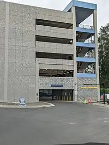 Construction of the station will require the demolition of a furniture store to the east of the bus bays, a well as a gas station, restaurant and strip mall.[18] Demolition of the stores began in July 2018 and the project broke ground in September 2019.[19][20] In early 2020, Sound Transit opened a temporary parking lot on the east side of 46th Avenue West to replace several closed areas of the park and ride that will be used for construction staging.[21] Construction on the five-story parking garage began in October 2020 and it opened for use on April 17, 2023.[22][23] The garage replaces the existing and temporary surface lots, which will be used for construction staging and bus layover space; 226 surface stalls will remain once construction is complete, giving Lynnwood Transit Center a total of 1,900 park and ride spaces.[23][24]