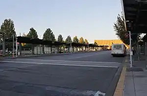 The Lynnwood Transit Center is located on the north side of Interstate 5 at 44th Avenue West, southwest of Alderwood Mall in Lynnwood. The 17.5-acre (7.1 ha) transit center includes 20 bus bays and a park and ride.[1] A five-story parking garage on the southeast side of the site provides 1,670 park and ride spaces and has driveways from two streets.[2] The bus bays have passenger information displays that have real-time arrival information for inbound buses. A customer service center called "RideStore" is located at the north end of the transit center.[3][4]